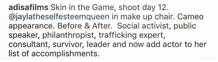 “Once we started pre-production on the movie, Jayla came on board as an Expert Consultant and worked closely with the various department heads in wardrobe, hair and make up, and the art department to bring this world to life. We also worked together on the script making it as authentic as possible. After the actors were selected, we decided to conduct a sort of mini sex trafficking “boot camp” for the cast explaining the world to them and what was at stake. Jayla’s tendency for detail and accuracy led the actors to affectionally nickname her “the truth”. ”